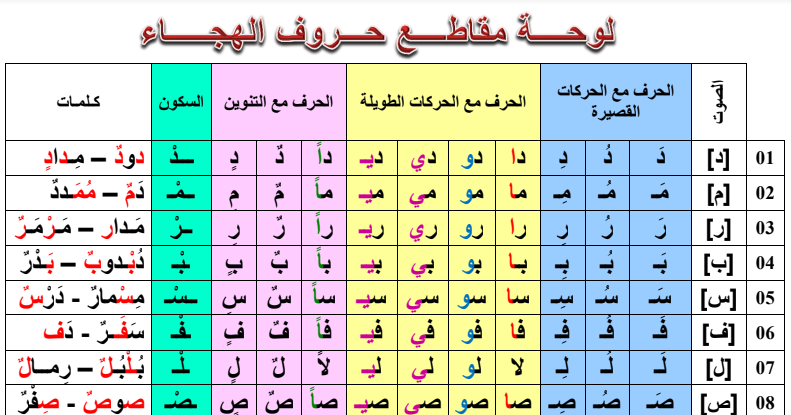 جدول الحروف الهجائية حسب الطريقة المقطعية Pdf