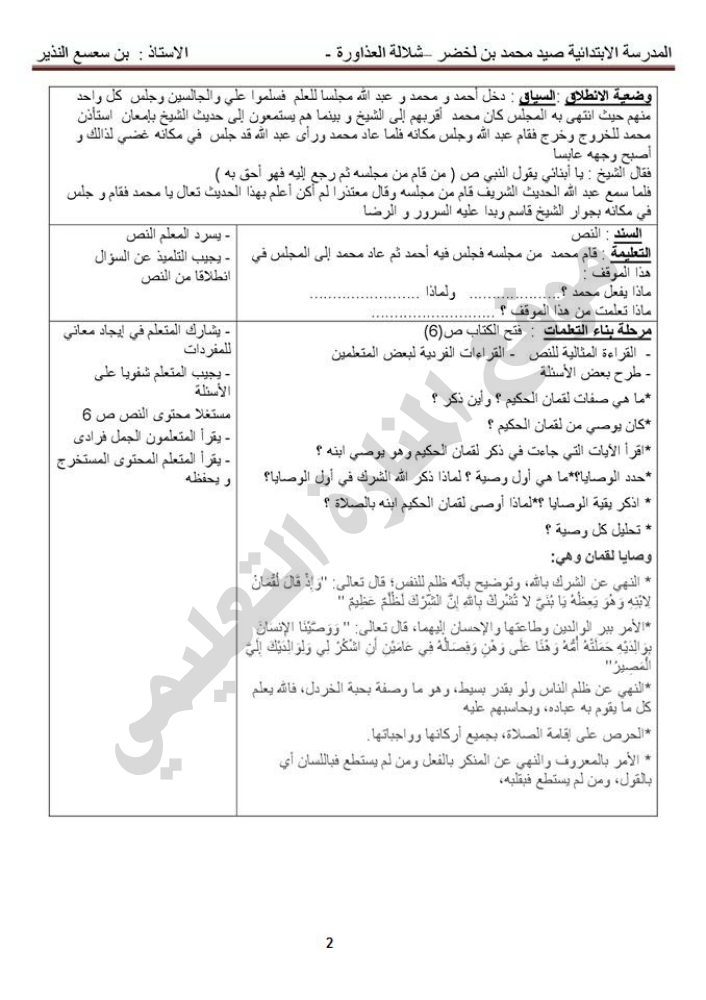 مذكرات درس من وصايا لقمان لابنه للتربية الاسلامية للسنة الخامسة المكيفة
