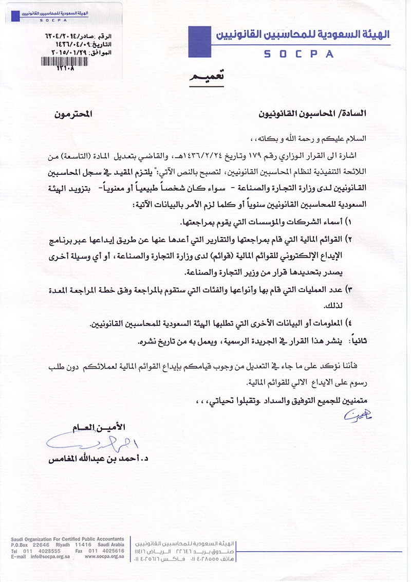 الهيئة السعودية للمحاسبين القانونيين تعاميم لمكاتب المحاسبة