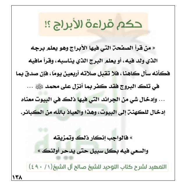 فوائد من القرآن V Tvittere تنبيه مهم جدا حكم قراءة الأبراج أو التصديق بها أو إدخال الجرائد التي تحتويها إلى البيت للعلامة صالح آل الشيخ Http T Co El5tua4qqs