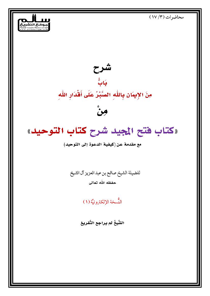 تفريغ شرح فتح المجيد شرح كتاب التوحيد باب من الإيمان بالله الصبر على أقدار الله