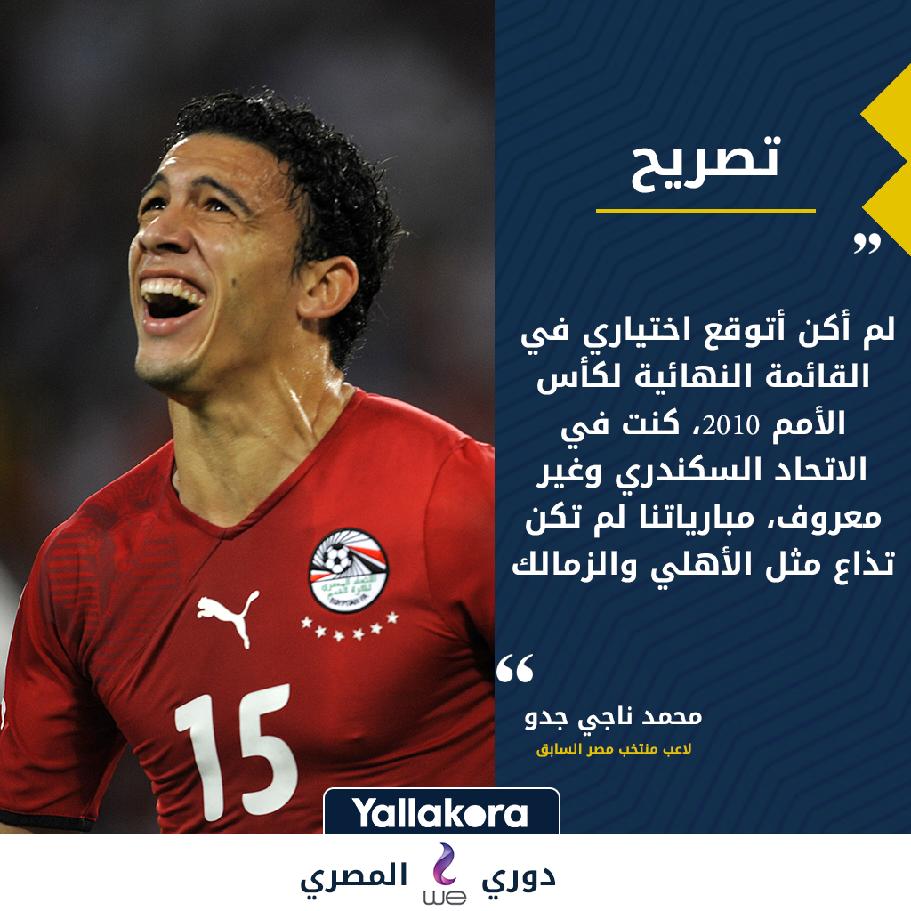 يلاكورة محمد ناجي جدو لم أكن أتوقع اختياري في القائمة النهائية لكأس الأمم 2010 كنت في الاتحاد السكندري وغير معروف مبارياتنا لم تكن تذاع مثل الأهلي والزمالك دوري وي المصري