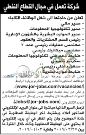 شركة تعمل في مجال القطاع النفطي بحاجة الى مهندسين مدير مالي ضابط موارد بشرية مدير موارد بشرية مدير It سكرتير تنفيذي مدقق داخلي رئيس قسم مشتريات محاسب الخ